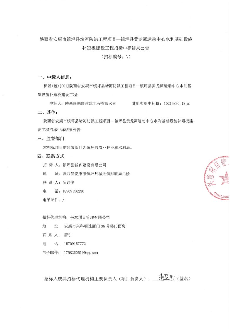 保标招标 > 防洪项目 > 中标信息 > 陕西省安康市镇坪县堵河防洪工程项目—镇坪县黄龙潭运动中心水利基础设施补短板建设工程招标中标结果公告